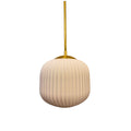 גוף תאורה תלוי המשלב קלאסיקה עם טוויסט מודרני. המנורה כוללת אהיל זכוכית לבנה בעלת טקסטורת פסים אנכיים (פליסה), המעניקה לאור איכות רכה, מפוזרת ונעימה. האהיל מוחזק על ידי מוט ובסיס עשויים פליז איכותי, שיוצרים ניגוד מושלם בין הלובן הנקי של הזכוכית לזהב העמוק של המתכת.