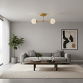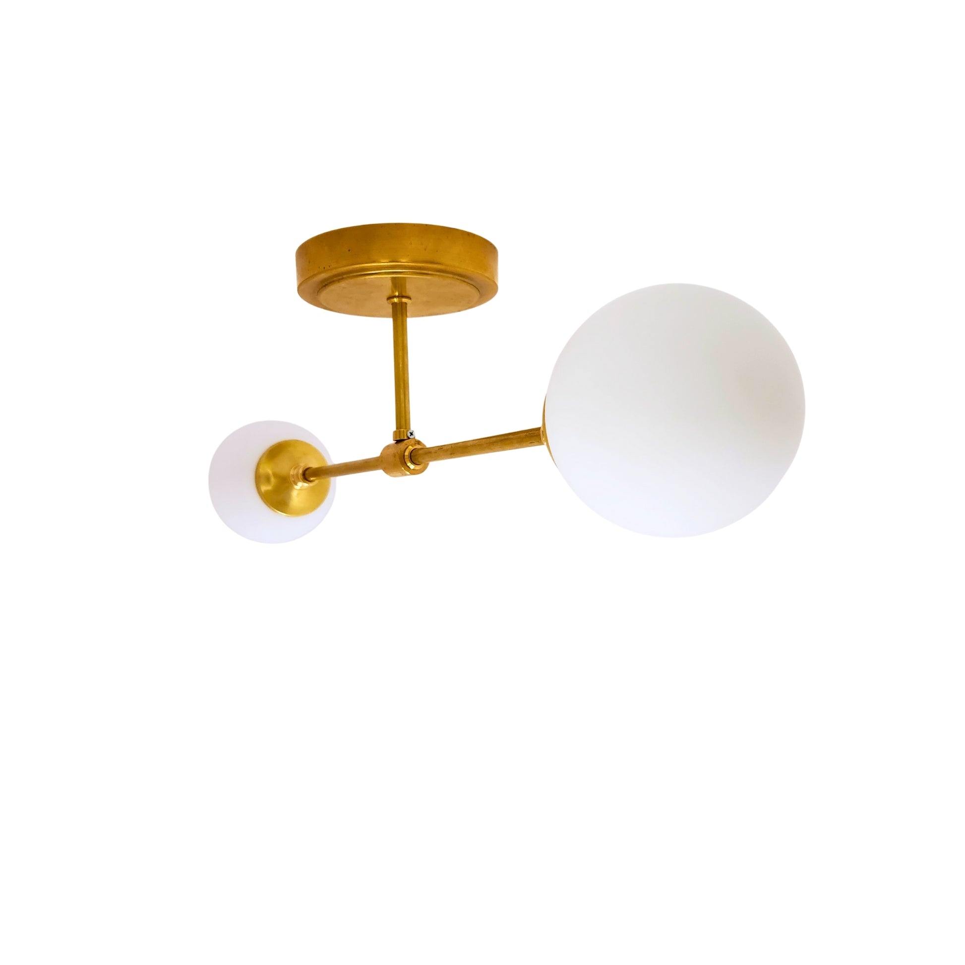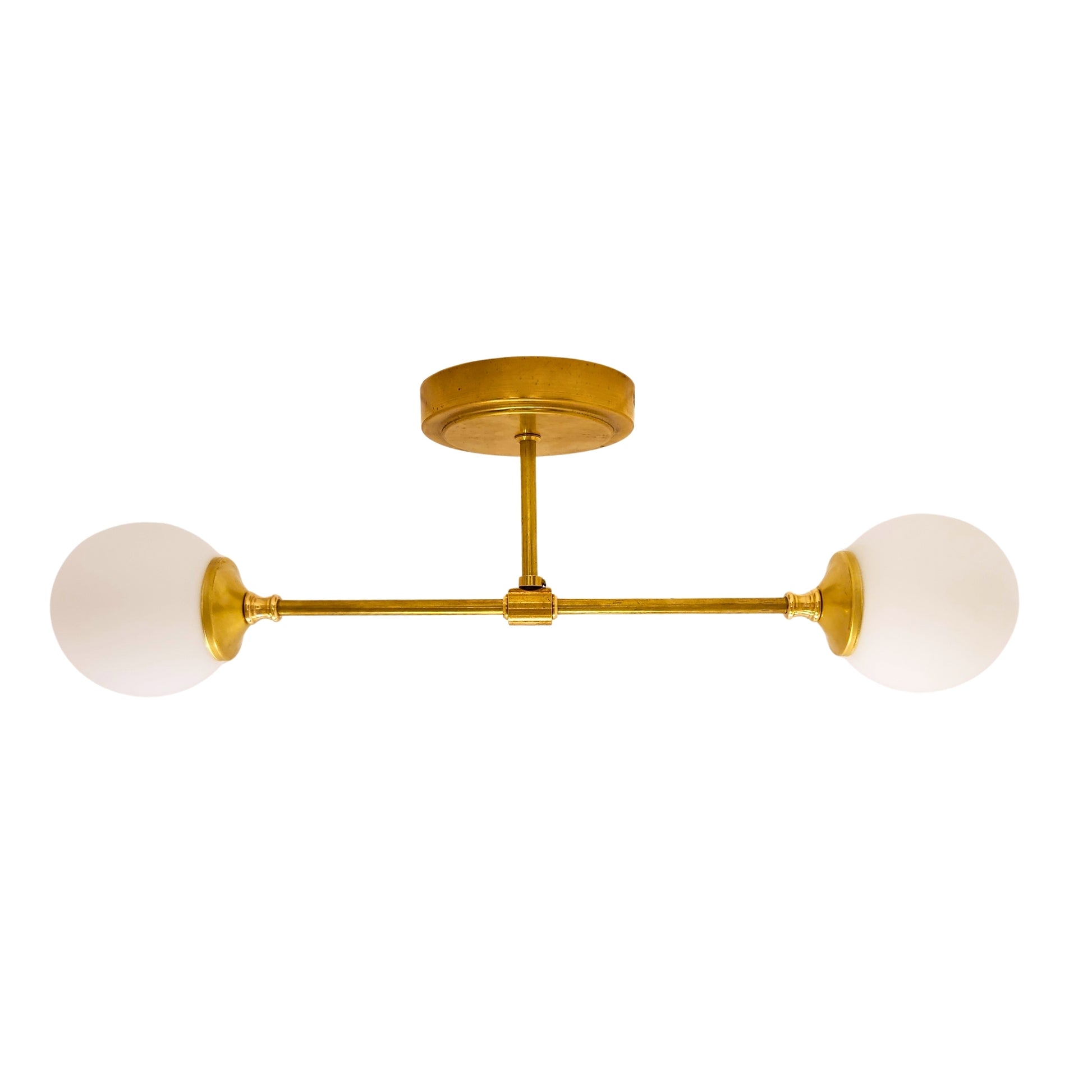 מנורת תקרה בסגנון וינטג' עשויה פליז עם שני גופי תאורה כדוריים מזכוכית חלבית. העיצוב הסימטרי והאלגנטי יוצר מראה קלאסי ומודרני כאחד, המתאים למגוון סגנונות עיצוב. היא אידיאלית ליצירת תאורת אווירה עדינה בסלון, במסדרון או פינת העבודה, ומוסיפה נגיעה של שיק ויוקרה.