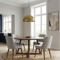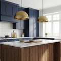 גוף תאורה תלוי (פנדנט) בעיצוב גיאומטרי נקי ועל-זמני. המנורה עשויה כולה מפליז איכותי בגימור מוברש, המעניק לחלל מראה יוקרתי עם נגיעה תעשייתית מעודנת. צורת הכיפה הקלאסית מאפשרת פיזור אור ממוקד ונעים כלפי מטה, מה שהופך אותה לתוספת מושלמת מעל אי במטבח, פינת אוכל או שולחן עבודה.